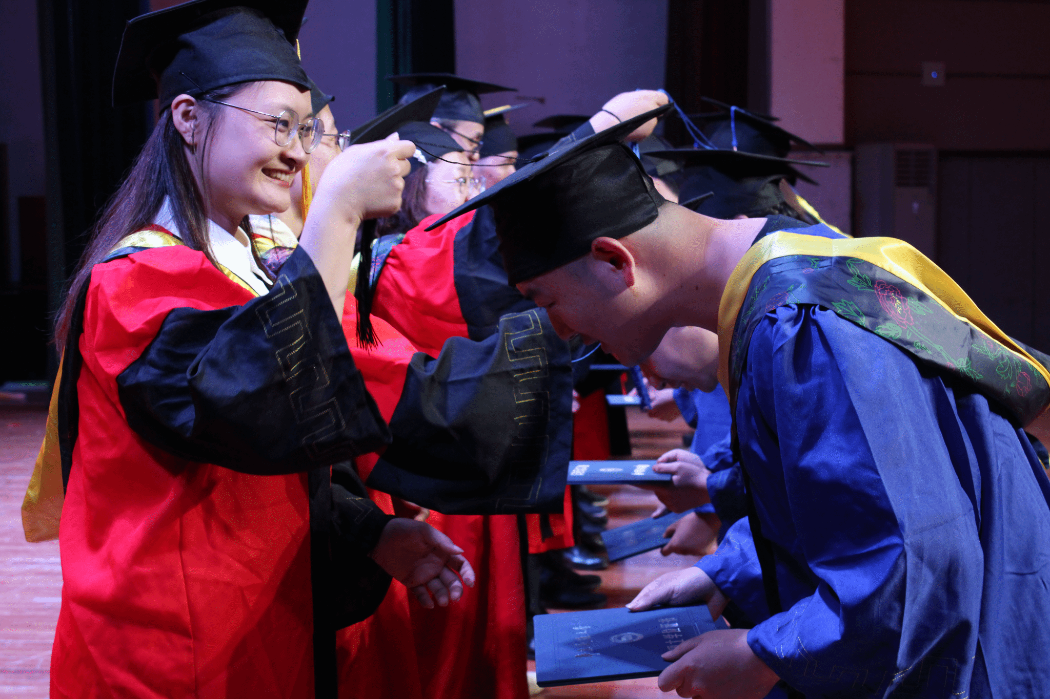 在毕业典礼的最后环节,导师为获得学士学位的本科毕业生扶正流苏,并一同合影留念。