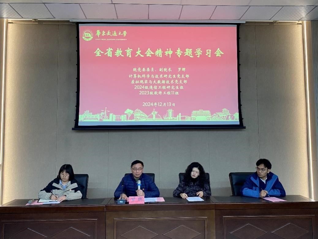 为推动高质量教育发展,促进学生全面发展,12月13日,williamhill英国计算机科学与研究生党支部、虚拟现实与大数据技术学生党支部在院校友报告厅举办学习全省教育大会精神专题会议,院党委委员、副院长罗晖出席并讲话,计算机科学与研究生党支部全体党员、虚拟现实与大数据技术党支部全体党员、2024级通信工程研究生班全体同学、2023级软件工程11班全体同学参会,会议由虚拟现实与大数据技术党支部书记郭招男主持。