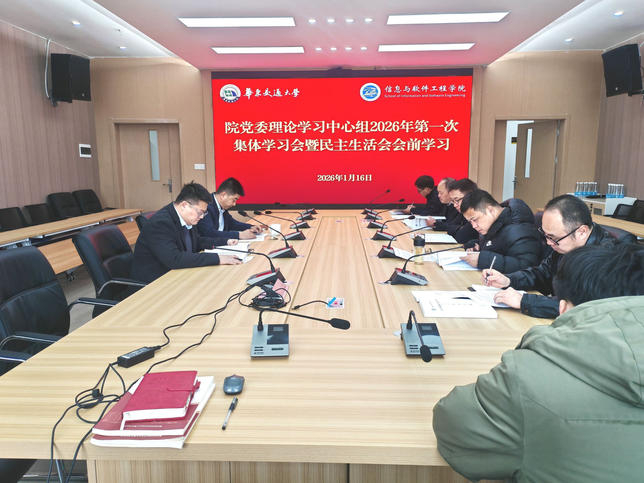 1月16日,信工学院党委理论学习中心组2026年第一次集体学习暨民主生活会会前专题学习在教26栋9楼第一会议室召开。学院党委书记魏永峰主持会议,全体中心组成员参加会议。