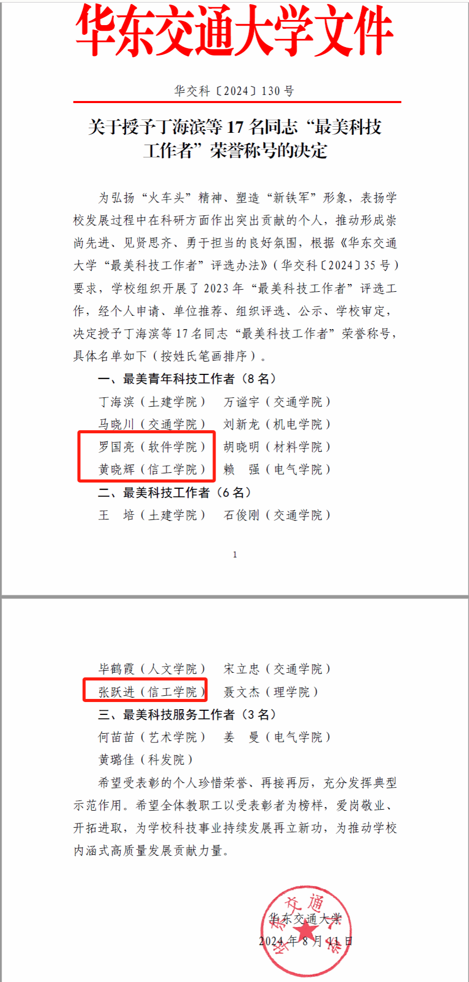 为弘扬“火车头”精神、塑造“新铁军”形象,增强学校事业凝聚力和感召力,推动全校形成崇尚先进、见贤思齐、勇于担当良好氛围,表扬在学校发展过程中在科研方面作出突出贡献的个人。根据《WilliamHill威廉希尔“火车头”荣誉评选办法》(华交科〔2024〕35号)文件要求,科发院组织开展了 2023年“最美科技工作者”评选工作,经个人申请、学院推荐、科研处组织评选并公示,williamhill英国教师罗国亮、黄晓辉荣获“最美青年科技工作者”称号(全校仅8名),张跃进荣获“最美科技工作者”称号(全校仅6名)。