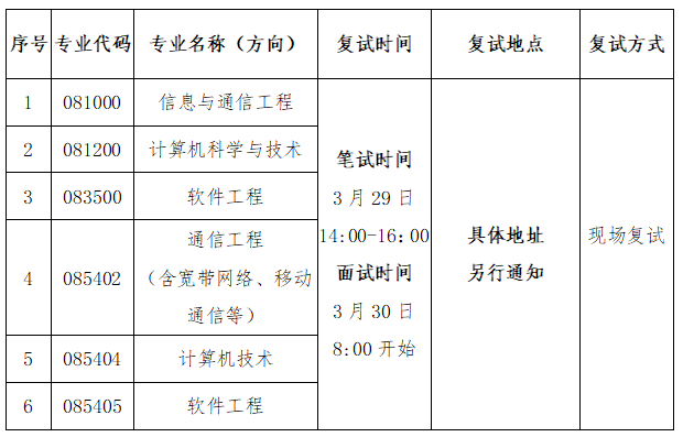复试时间、地点及方式详见下表。