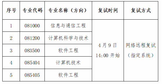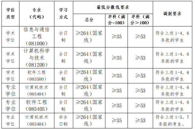 (6)我院所有可调剂专业要求考生一志愿报考专业为信息与通信工程(081000)、计算机科学与技术(081200)、软件工程(083500)、通信工程(085402)、计算机技术(085404)、软件工程(085405)。