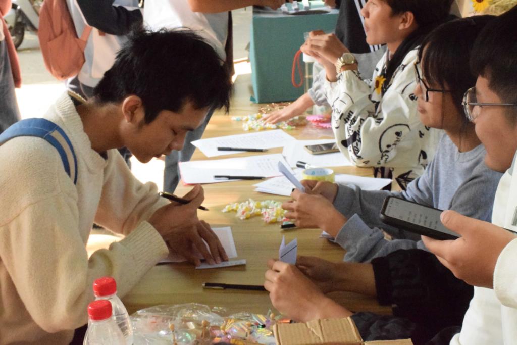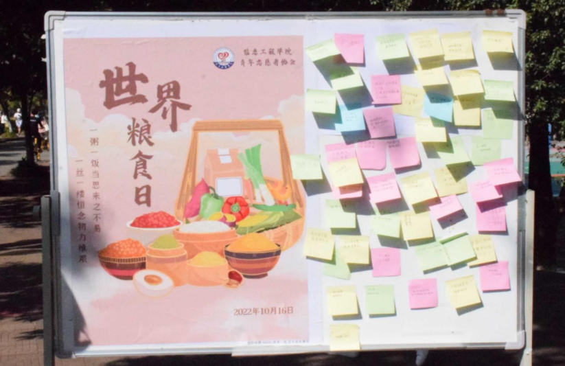 此次活动特别设立了寄语留言墙,参与活动的同学使用便签纸写下自己对节约粮食以及粮食安全重要性的认识,寄语留言墙上字字真诚,体现着信息学子践行“让节粮成为一种习惯”的决心。