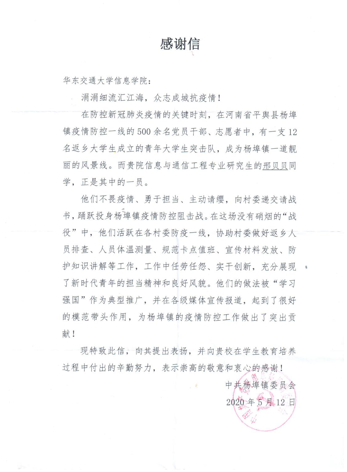 2020年的1月,新型冠状病毒来势汹汹,全国人民都进入了高度戒备的状态,积极与病毒作战。在全国上下人民共同努力下,疫情进入阶段性胜利,同学们也陆续返校,近日我院收到一封特殊的感谢信。