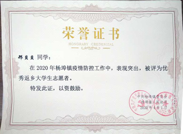 邢贝贝,来自河南省驻马店市平舆县,是信息学院信息与通信工程研究生党支部2018级研究生,在征得家人同意后,她第一时间参与了平舆县杨埠镇老任村委宣传防疫事项,为保障村民安全贡献一份力量。