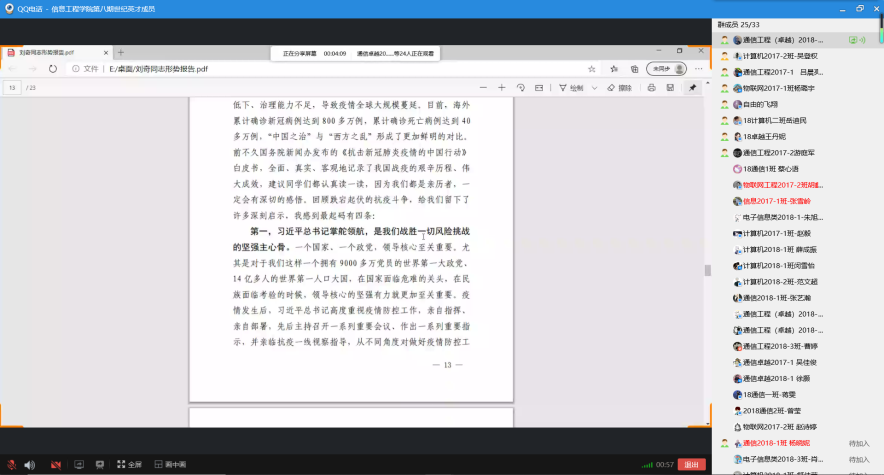 6月26日,信息学院第八期世纪英才召开“学习省委书记刘奇同志形势政策报告”线上主题班会,世纪英才班班主任艾国金及全体学员参与。本次班会由学员徐骥凯主持。