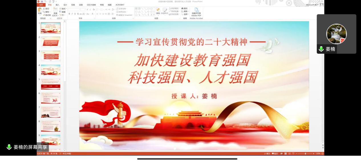 姜楠从三个方面全面阐述了如何加快建设教育强国、科技强国、人才强国:一是新时代我国教育、科技、人才工作取得的成就;二是深刻把握党的二十大报告中教育、科技和人才工作的部署亮点;三是新阶段我国教育、科技、人才工作的新任务。