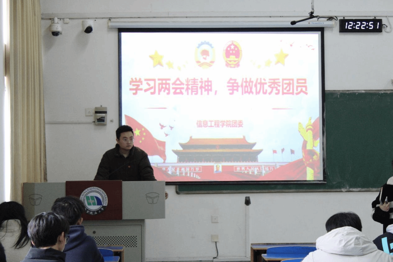 为迎接十四届全国人大二次会议和全国政协十四届二次会议,充分学习“两会精神”,3月7日,信息学院于14栋108室召开以“学习两会精神,争做优秀团干”为主题的学习活动。信息学院全体团支书参加,团委洪亚聪老师主讲。
