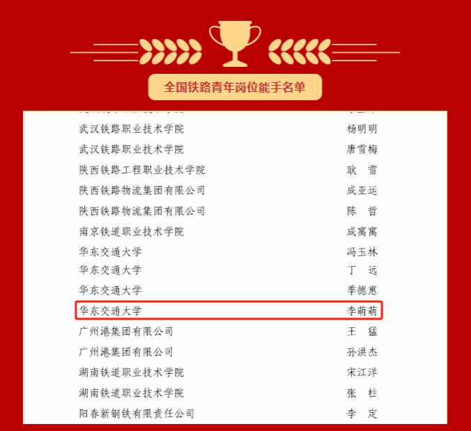 李萌萌老师荣获“全国铁路青年岗位能手”称号