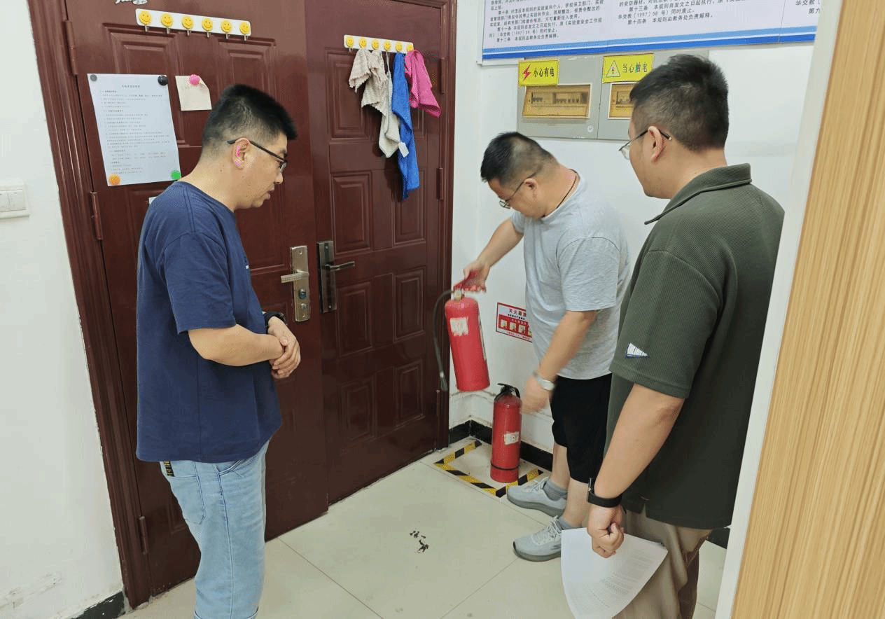 魏永峰一行实地走访实验室、办公室、学生宿舍。重点检查疏散通道、安全出口、消防车通道畅通情况,认真排查消防应急照明、疏散指示标志,逐一核查人员密集场所逃生通道和灭火救援器材,对留校学生进行消防安全教育。
